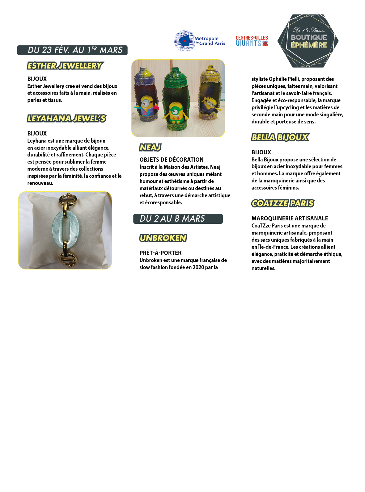 Une boutique éphémère est un espace de vente proposé pour une courte durée aux artisans, artistes, créateurs ou entrepreneurs qui ont besoin d’une vitrine.