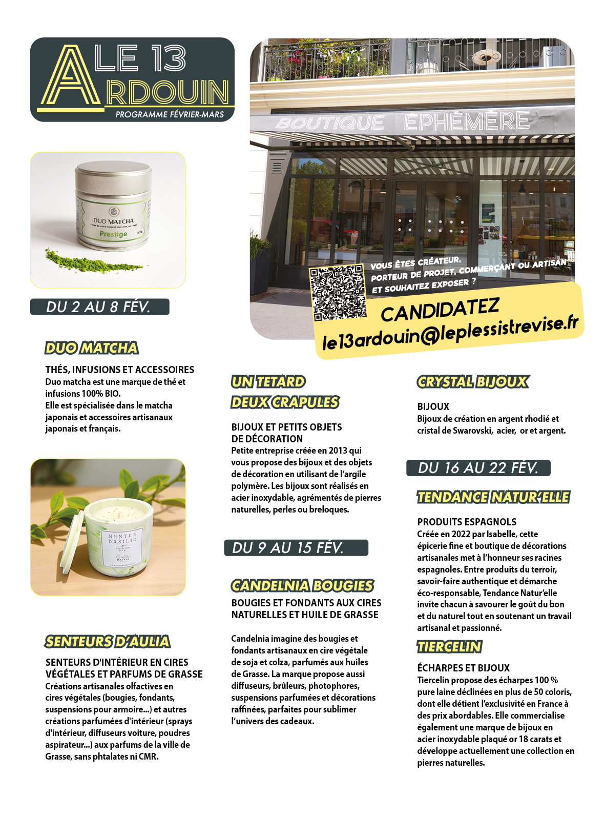 Artisans, commerçants, si vous souhaitez y exposer vos produits, articles, œuvres, envoyez le dossier de candidature ci-dessous à cette adresse :